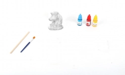 Gips zum Gießen des Einhorns; 2× Kristallsand; Farbbehälter; Pinsel; Messbecher; Rührstab