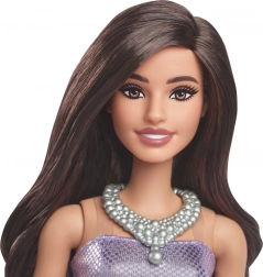 Die Barbie Puppe trägt ihr braunes Haar in sanften Wellen und ihr Look wird durch lustige Details wie eine silberne Halskette und passende Schnallen-Heels abgerundet. Sie ist bereit für glamouröse und glitzernde Veranstaltungen in ihrem lila Bubble-Kleid! Das trägerlose Korsett glänzt mit Pailletten und der Satinrock fügt viele lustige Rüschen hinzu.