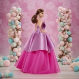 Die Puppe trägt ein fantastisches Outfit mit einem rosa Rock und einem lila gemusterten Oberteil, verziert mit einer großen Schleife an der Schulter.