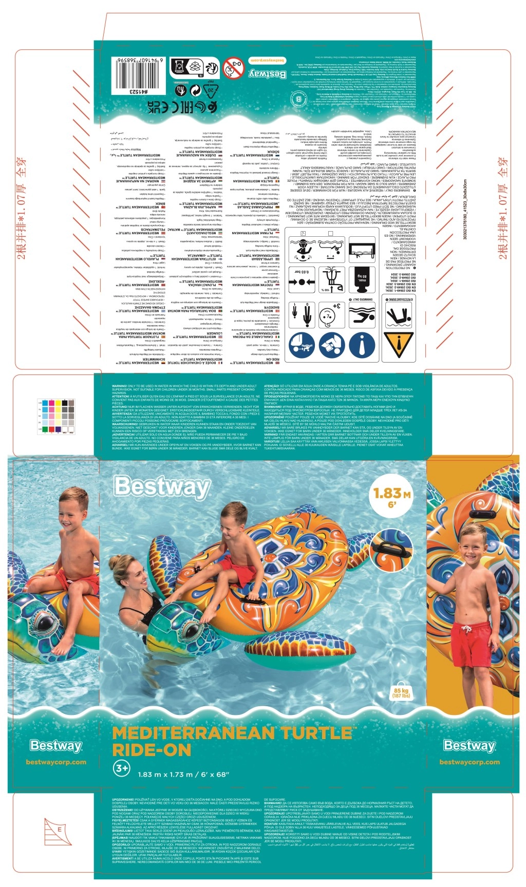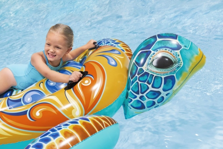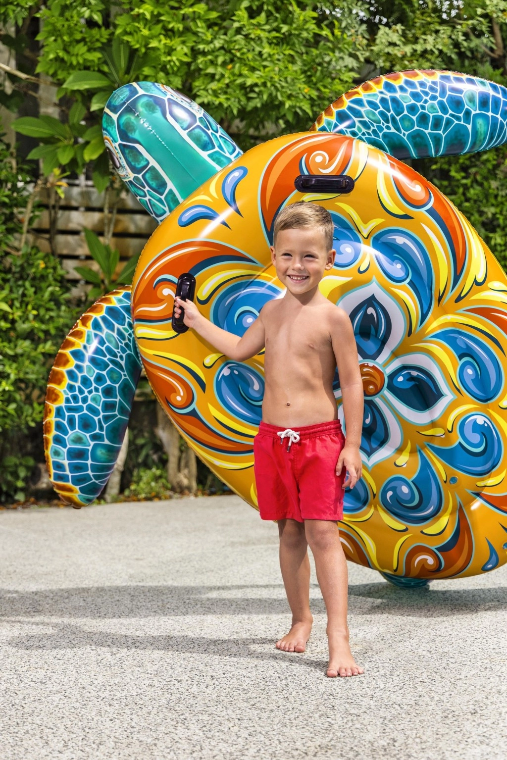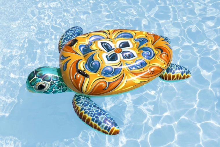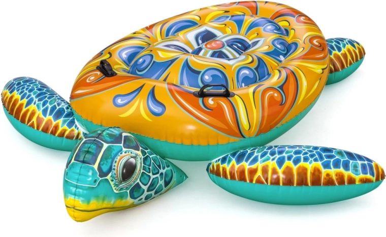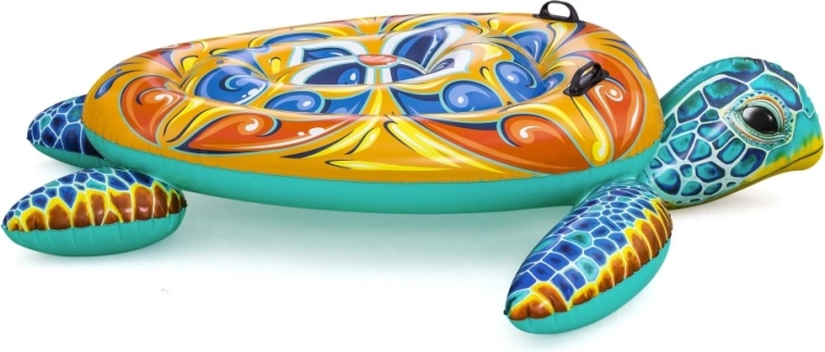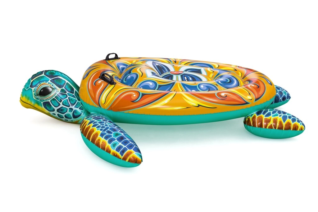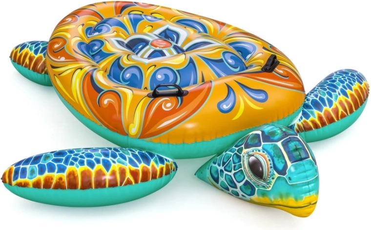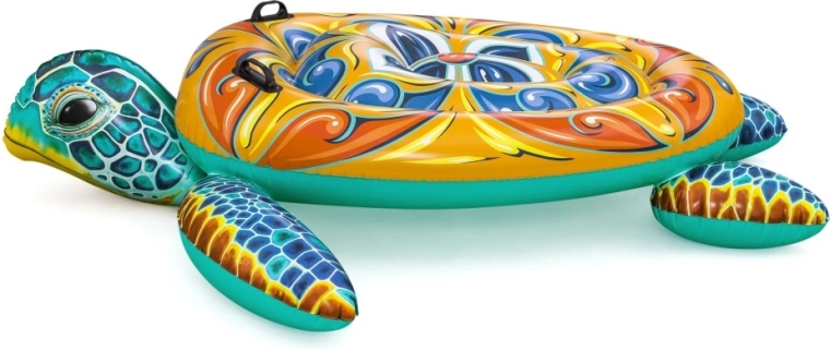 Die aufblasbare Schildkröte von Bestway mit markantem Majolika-Print ist die ideale Wahl für Wasserspaß. Dank der großzügigen Abmessungen von 183 × 173 cm bietet sie komfortablen Platz zum Liegen und Fahren, während zwei integrierte Griffe einen sicheren Halt und Stabilität beim Aufsteigen und Spielen gewährleisten.