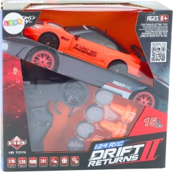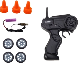 Enthalten sind zwei Reifentypen – mit Profil für besseren Grip und glatte Räder für eindrucksvolle Drifts. Bauen Sie Ihre eigene Strecke mit den mitgelieferten Hütchen und trainieren Sie Kurvenfahrten und Slalom. Das Auto wird von einem 3,7-V-Akku (im Lieferumfang) betrieben, die Fernsteuerung benötigt 2× AA (nicht enthalten).