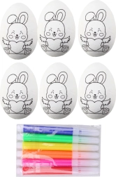 Gestalten Sie einzigartige Osterdekorationen mit dem Set aus Polystyrol-Eiern mit vorgedrucktem Häschenmotiv. Die glatte, weiße Oberfläche eignet sich hervorragend zum Malen, Verzieren und Beschriften. Bunte Filzstifte sind enthalten, sodass Sie direkt nach dem Auspacken loslegen können.