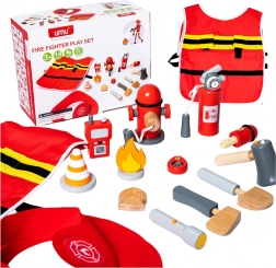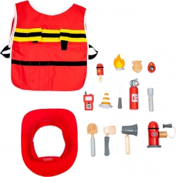 Zu den Elementen des Sets gehören ein Feuerwehrhelm, ein Kostüm, ein Feuerlöscher und weiteres Zubehör wie Megafon und Funkgerät.