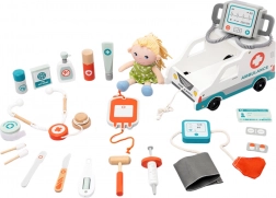 Anzahl der Elemente im Set: 22 Elemente einschließlich Defibrillator, Stethoskop, Blutdruckmessgerät, Skalpell, Krankenwagen und weiteres medizinisches Zubehör.