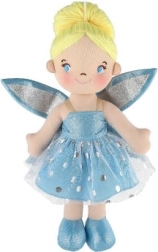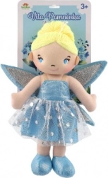 Die Puppe ist in einem blauen Kleid mit glitzernden Flügeln gekleidet, was ihr ein wahres Märchen-Aussehen verleiht.