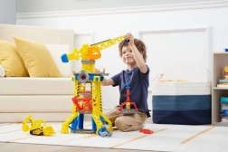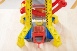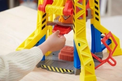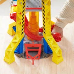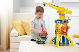 Stellen Sie Rubble in den Aufzug und heben Sie ihn zur Spitze des Turms in die Kranführerkabine. Verwenden Sie den Kran, um Blöcke anzuheben und an den richtigen Ort zu transportieren. Drücken Sie für weitere Überraschungen den großen roten Knopf am Turm, um die Lichter und Geräusche aus der Serie einzuschalten. Für zusätzlichen Spaß suchen Sie nach weiteren Bau-Trucks und Figuren aus der Rubble & Crew-Serie.