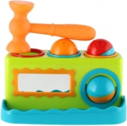 Diese farbenfrohe Klopfbank aus Kunststoff mit einer Länge von 21 cm ist eine hervorragende Wahl für die ersten entwicklungsfördernden Spiele. Mit dem Hämmerchen schlagen Kinder sicher drei Bälle in die vorgesehenen Öffnungen und trainieren dadurch Griff, Kraft und Genauigkeit. Der integrierte Spiegel an der Vorderseite steigert Interaktion und Spielspaß.