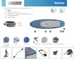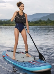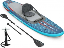 In wenigen Schritten machen Sie daraus ein komfortables Sit-on-Top-Kajak – einfach den Sitz mit Rückenlehne und die Fußstütze befestigen. Integrierte Griffe, elastische Bungeeseile vorne und hinten sowie hintere D-Ringe ermöglichen das Sichern von persönlichen Gegenständen oder einer Kühltasche. Drei abnehmbare Finnen verbessern die Spurtreue, die Sicherheits-Leash mit Schnellverschluss kann am Knöchel oder an der Hüfte getragen werden. Die doppeltwirkende Handpumpe sorgt für zügiges Aufpumpen; nach der Fahrt lässt sich das Board schnell entlüften und im Deluxe-Rucksack verstauen.