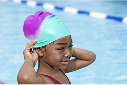 Der ergonomische Schnitt passt sich dem Kopf an, schützt Haare und Ohren vor Spritzwasser und hilft zugleich, den Widerstand zu verringern für ein flüssigeres Schwimmen. Das mehrfarbige Design erhöht die Sichtbarkeit im Becken und kommt bei Kindern bestens an.