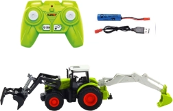 Der realistisch gestaltete Traktor im Maßstab 1:24 vereint landwirtschaftliche und bauliche Arbeiten in einem. Die Frontschaufel ist drehbar, der hintere Arm dient als kleiner Bagger und die LED-Lichter sorgen auch in der Dämmerung für einen attraktiven Effekt. Gummireifen und die teilweise Metallkonstruktion bewältigen intensives Spielen drinnen und draußen.