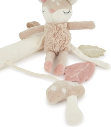Durchdachte Details fördern die Entwicklung der Feinmotorik und der Sinne – verschiedene Texturen laden zum Anfassen ein, raschelnde Blätter und das rasselnde Rehkitz fördern das Hörvermögen, während der Pilz mit sanftem Summen das Baby fasziniert und beruhigt. Einfache Pflege und hochwertige Verarbeitung sorgen für eine lange Lebensdauer.