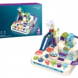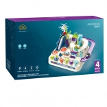 Das Set enthält eine farbige Hindernisbahn mit einem durchdachten Design, das maximalen Spaß gewährleistet und die Fantasie des Kindes anregt. Mit den vier Autos kann das Kind verschiedene Hindernisse wie Rutschen oder Brücken überwinden. Der Einsatz von speziellen Tasten und Steuerknöpfen auf dem Brett fördert die Entwicklung des logischen Denkens und der Motorik.