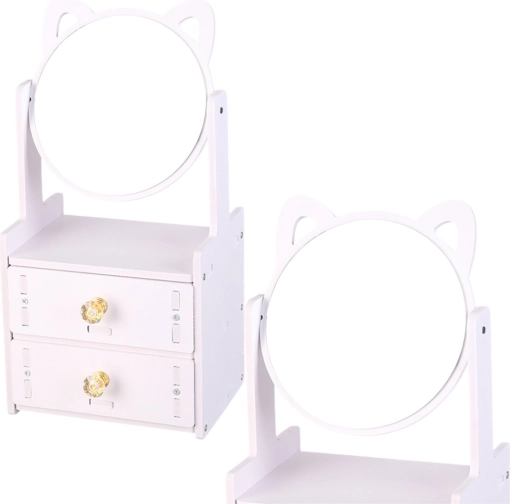 Der Schminktisch zeichnet sich durch ein einzigartiges Design aus, das moderne Eleganz mit niedlichen Details verbindet. Der Spiegel in Form von Katzenohren verleiht dem Set einen unverwechselbaren Charakter, und seine um 360° drehbare Konstruktion ermöglicht eine einfache Anpassung des Blickwinkels, was Schminken und Pflege noch komfortabler macht.