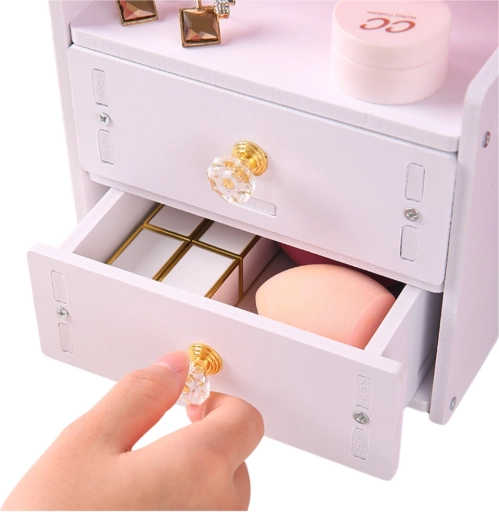 Die elegante Mini-Toilette mit Spiegel ist die ideale Lösung für alle, die eine praktische und ästhetische Art der Organisation von Kosmetik und Schmuck suchen. Dank der kompakten Abmessungen passt sie perfekt in kleine Räume und lässt sich leicht auf Tischen, Kommoden oder klassischen Schminktischen platzieren, ohne zu viel Platz einzunehmen.