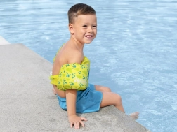 Die bunte Kinder-Schwimmweste mit Ärmeln BESTWAY Puddle Jumper mit einer sympathischen Schildkröte gibt kleinen Schwimmern Sicherheit und Freude am Wasser. Geeignet für Kinder von 2 bis 6 Jahren (15–30 kg) – sie kombiniert ein sicheres Rückenverschluss-System, bequeme Schaumpolster und robusten Polyesterstoff für komfortiges und sicheres Spiel im Wasser.