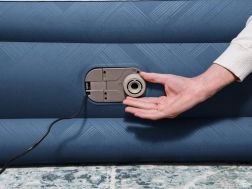 Die integrierte elektrische Pumpe 220–240 V bläst das Bett in etwa 3 Minuten auf. Es besteht auch die Möglichkeit des manuellen/pedalbetriebenen Nachpumpens außerhalb der Reichweite von Stromquellen.