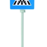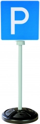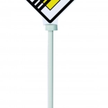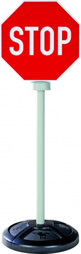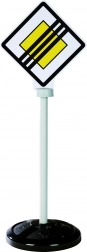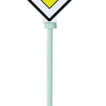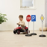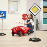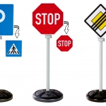 Das Set enthält drei stabile Schilder, jedes mit einem beidseitigen Druck, der insgesamt fünf realistische Verkehrssymbole darstellt: STOP, Vorfahrtstraße, Ende der Vorfahrtstraße, Parkplatz und Fußgängerüberweg.