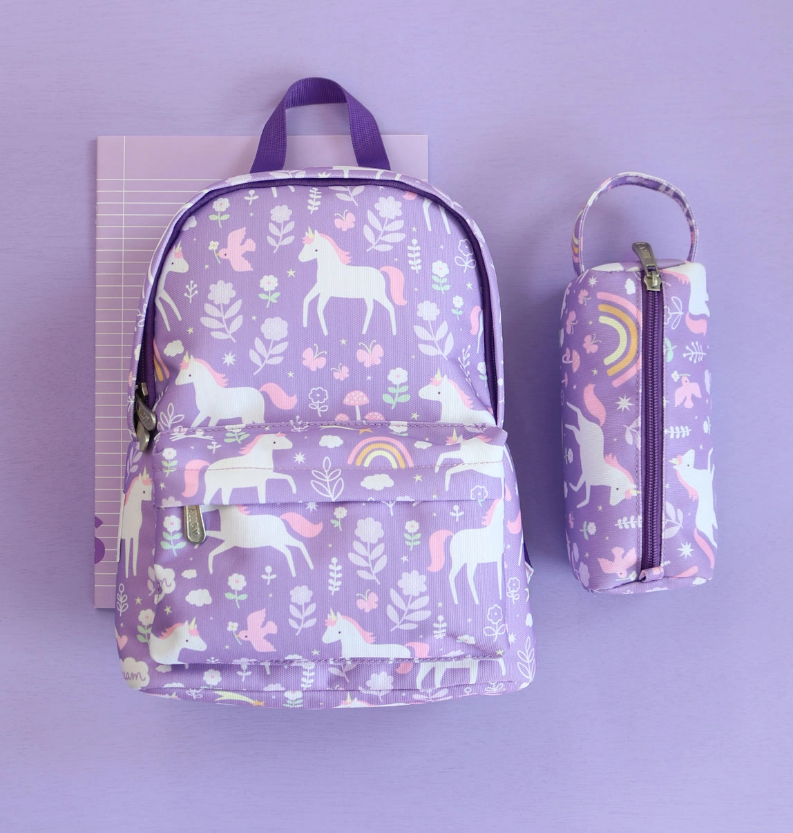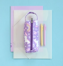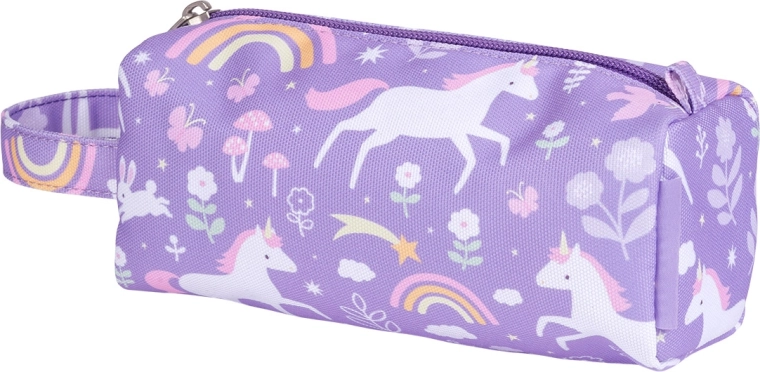 Lila Federmäppchen für Buntstifte, Filzstifte oder Schreibwaren mit Einhorn-, Blumen- und Regenbogenmotiven, hergestellt aus nachhaltigem Polyester. Ideal für Schule, Reisen oder Clubs, mit Reißverschluss und bequemer Trageschlaufe für einfaches Mitnehmen. Sichert die sichere Aufbewahrung Ihrer Schreibwaren.