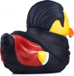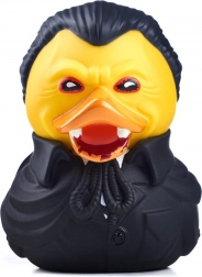 Die Ente ist im Dracula-Stil gestaltet, was ein gelbes Gesicht, scharfe Zähne und einen dunklen Umhang beinhaltet.