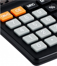 Er verfügt über grundlegende arithmetische Operationen, Speicherfunktionen (M+, M-, MR, MC), Prozentrechnung und Quadratwurzel. Kontrastreiche orange Funktionstasten und große Ziffern ermöglichen eine schnelle Orientierung und minimieren Eingabefehler.
