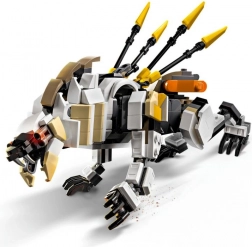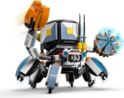 Baue und arrangiere zwei detailreiche Maschinen: den Krabbenklaw mit beweglichen Gliedmaßen, aufklappbaren Scheren, abnehmbarer Kapsel und Energieschild sowie den Sägezahn mit aufklappbarem Maul, drehbarem Torso und beweglichem Hals, Kopf und Beinen. Die Szene wird durch hohe Gräser, eine Feuerstelle und eine Schatztruhe für kreative Geschichten abgerundet.