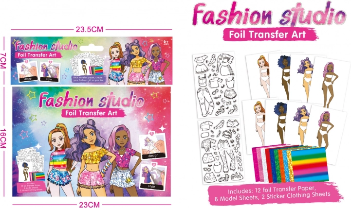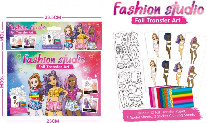 Entdecken Sie Ihre Kreativität mit einem Design-Portfolio, das 8 Modelle, 2 Blätter Kleidungsschablonen und 12 farbige Klebefolien enthält.