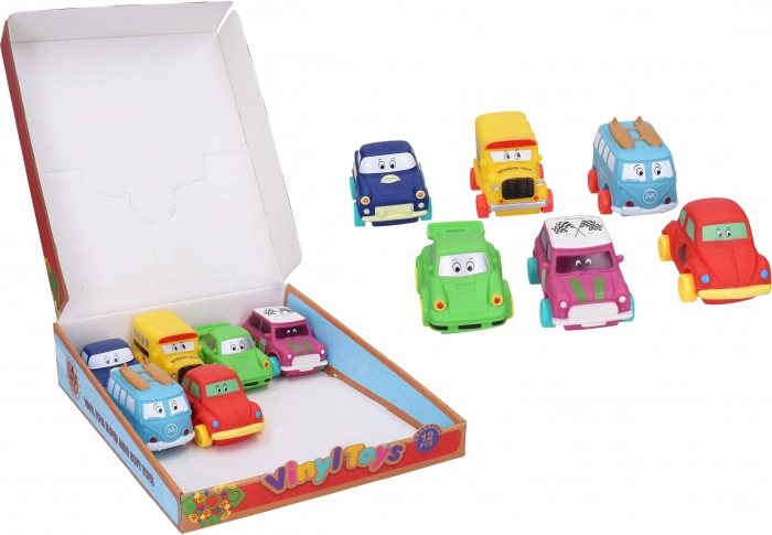 Leichtes Spielzeugauto aus weichem Kunststoff mit einer Länge von 9 cm und Freilauf-Rädern. Es gibt 6 Varianten: Käfer, Trabant, Sportwagen, Mini, Bus, Lieferwagen. Auch erhältlich als Display-Box mit 12 Stück.