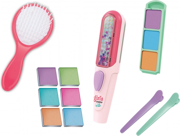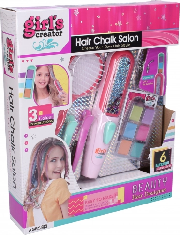 Kreieren Sie originelle Frisuren mit dem praktischen Set für farbiges Haarstyling. Es enthält eine Bürste, Haarclips, Haarkreiden und einen Farbapplikator für ein einfaches und unterhaltsames Stylen der Haare zu Hause.