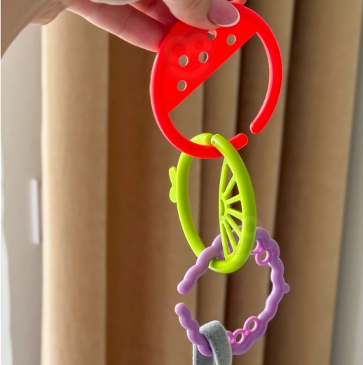 Die Ringe lassen sich im Handumdrehen zu einer Kette verbinden und schnell am Kinderwagen, Autositz oder Spielbogen befestigen – praktisch für unterwegs und zu Hause.