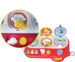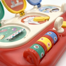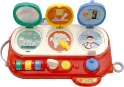 Dieses clevere Lernspielzeug hat drei Fenster, die sich jeweils auf unterschiedliche Weise öffnen – mit einer Kombination von Symbolen, einem Schlüssel oder einer Taste mit Drehregler. Im Inneren finden Kinder verschiedene Überraschungen: herausziehbare „Tücher“, ein Zahn-Motiv mit beweglicher Bürste sowie eine Figur mit drehbarer Auswahl an Kleidungsstücken. Jede Handlung hat ein klares Ergebnis, was das Verständnis von Ursache und Wirkung stärkt.