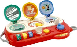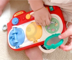 Tasten, Schalter und drehbare Elemente fördern die Feinmotorik und die Hand‑Augen‑Koordination und halten dank kontrastreicher Farben die Aufmerksamkeit.