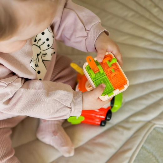 Das Set umfasst 4 interaktive Bausteine: ein orangefarbenes Schlöschen mit Schlüssel zum Üben von Griff und Koordination, Fenster mit Riegel und Schiebesicherung zum Erkunden von Ursachen und Folgen, ein drehbares Element mit Kügelchen zur visuellen Stimulation sowie Riemen mit Schnallen und Schlaufen, die an einen Propeller erinnern, zum Üben des Schließens. Alles besteht aus robusten und sicheren Materialien, die für kleine Kinder geeignet sind.