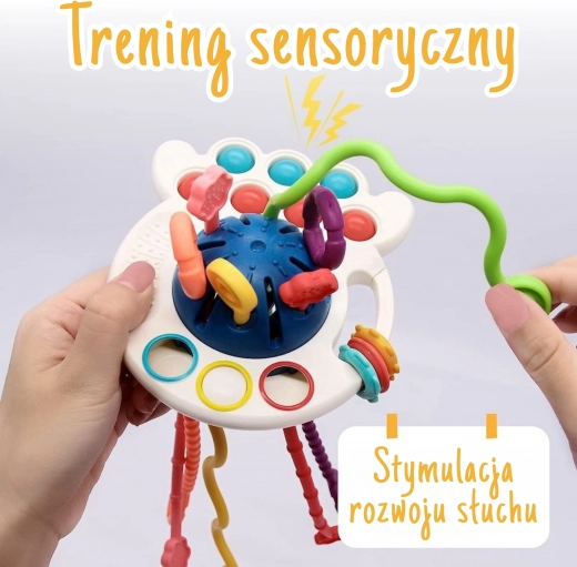 Entdecken Sie ein multifunktionales Sinnes-Spielzeug und einen Beißring nach der Montessori-Methode, das die Sinnesentwicklung, die feinmotorischen Fähigkeiten fördert und bei Zahnen Linderung verschafft. Bunte Zugschnüre mit verschiedenen Texturen, Dreh-Elemente und Pop-Bubbles laden zum Greifen, Ziehen und Entdecken ein, während sichere Materialien und leichte Pflege Eltern erfreuen.