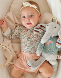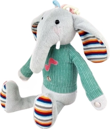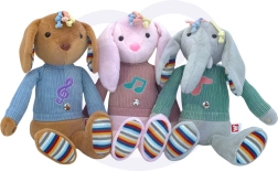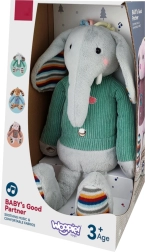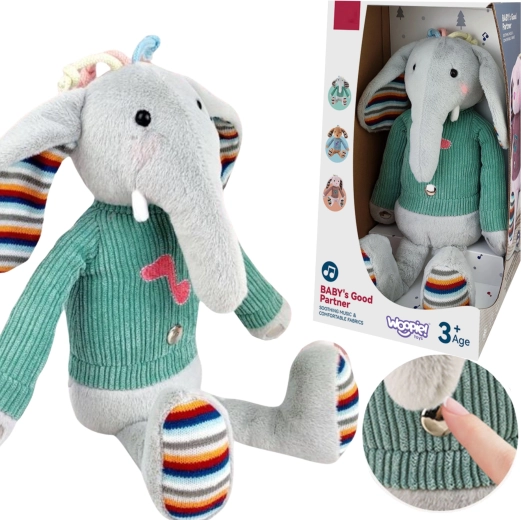 Der interaktive Plüschelefant Woopie ist mit drei sensorischen Zonen an den Beinen und am Bauch ausgestattet, die bei Berührung Musik abspielen. Seine rosa Gesichter sind beleuchtet, was um das Spielzeug eine magische Atmosphäre schafft. Der Plüschelefant ist in einen Pullover gekleidet, unter dem Platz für 3 Batterien ist. Dieser weich anzufassende kleine Elefant wird ein Freund des Kindes für viele Jahre.