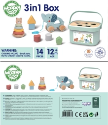 Dieses vielseitige Set fördert die kindliche Entwicklung durch Spiel: Kinder sortieren Formen in den Deckel der Sortierbox, stapeln buntfarbige Ringe auf die Stange der Bären-Pyramide und trainieren das Laufen sowie die Koordination mit dem Zieh-Elefanten. Nach dem Spielen wird alles im verschließbaren Box mit Griff verstaut – Ordnung in wenigen Augenblicken.