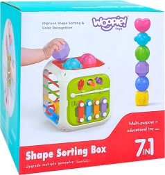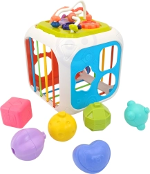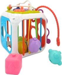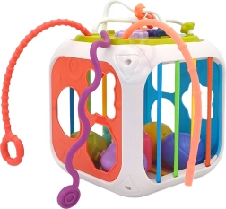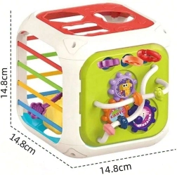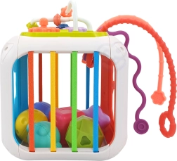 Der Würfel besteht aus hochwertigem ABS-Kunststoff und Silikon, ist robust und sicher für kleine Kinderhände. Enthalten sind auch Sortierklötze mit versteckten Glöckchen, die zum Experimentieren mit Klang, Formen und Farben anregen. Der abnehmbare obere Teil erweitert die Spielmöglichkeiten – das Kind kann ihn separat auf einer Unterlage oder im Kinderwagen verwenden.