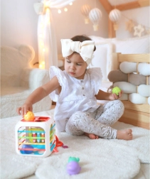 Der WOOPIE Aktivitätswürfel ist ein durchdachtes Lernspielzeug, das in einer kompakten Form eine Vielzahl an Aktivitäten für die tägliche Entdeckung bietet. Vom abnehmbaren oberen Panel mit Mini-Xylophon über Zahnräder und ein Perlenlabyrinth bis hin zu strukturierten Schnüren – jede Seite liefert einen neuen Reiz für die Entwicklung der Hand-Auge-Koordination, Konzentration und Kreativität.