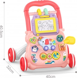 Lauflernwagen ist mit einem Zeichenbrett ausgestattet, das die Kreativität des Kindes weckt und ihm ermöglicht, eigene Zeichnungen und Muster zu erstellen. Auf dem Spielzeug befindet sich auch ein interaktiver Elefant, der nach dem Drücken von Tasten fröhliche Melodien spielt. Enthält auch ein Set von Blöcken in verschiedenen Formen, auf denen Tierbilder aufgedruckt sind. Diese Elemente bringen in das Spiel das Lernen von Formen, Farben und Tieren. Bewegliche Zahnräder, die sich drehen, wenn sie bewegt werden, bieten dem Kind ein lustiges Überraschungselement. Sicherheit beim Spielen garantiert das Radblockiersystem, das den Lauflernwagen auch bei den ersten unsicheren Schritten des Kindes stabil hält. Ein Spiegel, der am Lauflernwagen angebracht ist, ermöglicht es dem Kind, sein eigenes Spiegelbild zu erkennen, was ein wichtiger Aspekt der Selbstbewusstseinsentwicklung ist.