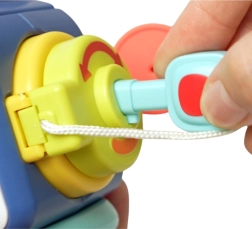 Die linke Seite des Würfels enthält ein Pop-it-Spielzeug, das beim Drehen ein Geräusch erzeugt. Die rechte Seite verbirgt ein Geheimnis, sobald man den fest an einer Schnur befestigten Schlüssel dreht.