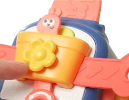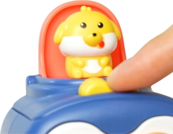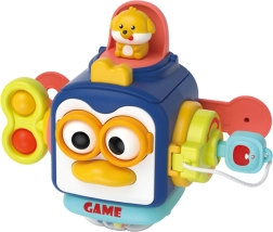Auf dem Kopf des Pinguins befindet sich eine Achse mit einem heraus springenden Hund, der weiteren Spaß und Interaktivität bietet.