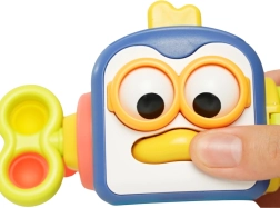 Der runde Pinguin enthält bewegliche Elemente - beim Drücken der Nase schnurrt das Spielzeug und die Augen beginnen sich zu bewegen.