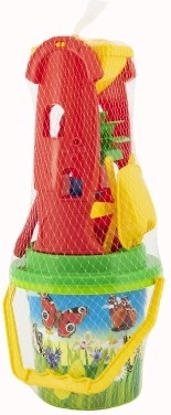 • Komplette Ausstattung: Eimer, Mühle, Schaufel, Rechen und Förmchen für verschiedene Formen.
