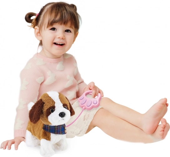 Niedlicher Plüschhund mit einer Größe von 22 cm, der nach Anschluss des Kabels mit Fernbedienung gehen, bellen, mit dem Schwanz wedeln und den Kopf bewegen kann. Die Bedienung ist einfach: Durch Drücken der Leine startet der Spaziergang, durch Berühren des Kopfes aktivieren Sie Effekte und nach einem Klatschen setzt der Hund seinen Weg fort. Ein großartiges interaktives Spielzeug für Kinder, das Spaß macht und die Sinne fördert.