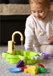 Nach dem Befüllen der Spüle und dem Einschalten des Wasserhahns beginnt das Wasser zu zirkulieren – Kinder können Obst und Geschirr „waschen“ wie die Großen.