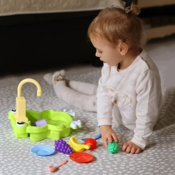 Im Set enthalten ist umfangreiches Zubehör: Geschirr, Besteck, eine Flasche für „Spülmittel“, Obst und Gemüse. Das Spiel fördert sensorische Wahrnehmung, Hand-Auge-Koordination und kreatives Spiel. Das Set besteht aus robustem Kunststoff mit glatten Kanten für eine sichere Nutzung.