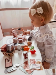 Scanne die Artikel aus dem Set mit dem typischen Geräusch, lege sie auf die Waage und notiere den Preis. Kinder erleben einen echten Einkauf von A bis Z.