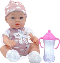 Die Puppe hat weiche Gummi-Arme und -Beine sowie einen festen Kunststoffkörper ohne Plüschfüllung, was Robustheit und einfache Pflege gewährleistet. Im Set ist außerdem ein rosa Fläschchen enthalten, das die Puppe in den Händen halten kann – perfekt für das Fütter-Spiel.