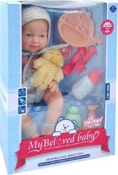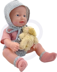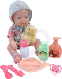 Das Set bietet alles, was kleine Pflegeprofis brauchen: eine angezogene Puppe, einen Schnuller, einen Teddybären, ein Fläschchen und ein Ess-Set (Teller, Gabel, Löffel), ergänzt durch zwei Fläschchen „Kosmetik“ für Bade- und Pflegeszenarien. Die Puppe besitzt weiche, gummiartige bewegliche Gliedmaßen und einen Kunststoffkörper ohne Plüschfüllung.