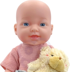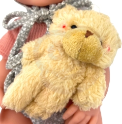 Zum Set gehört ein weicher Teddybär, den die Puppe in der Hand halten kann. Er fördert die emotionale Bindung und beruhigende Rituale beim Spielen.