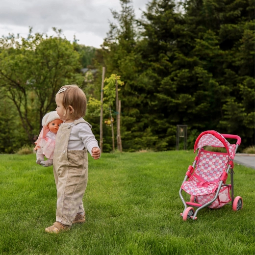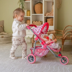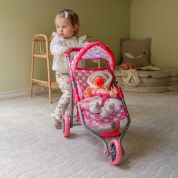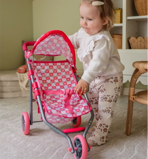 Dieser rosafarbene, dreirädrige Puppenwagen ist ideal für Kinder ab 3 Jahren, die realitätsnahes Familienspiel lieben. Der leichte, aber robuste Metallrahmen und die einfache Handhabung sorgen für sicheres, sanftes Fahren in der Wohnung und im Freien. Der stilvolle Bezug mit Herzchen begeistert kleine Fürsorgerinnen und ist leicht zu pflegen – die Bezüge können abgenommen und gewaschen werden.